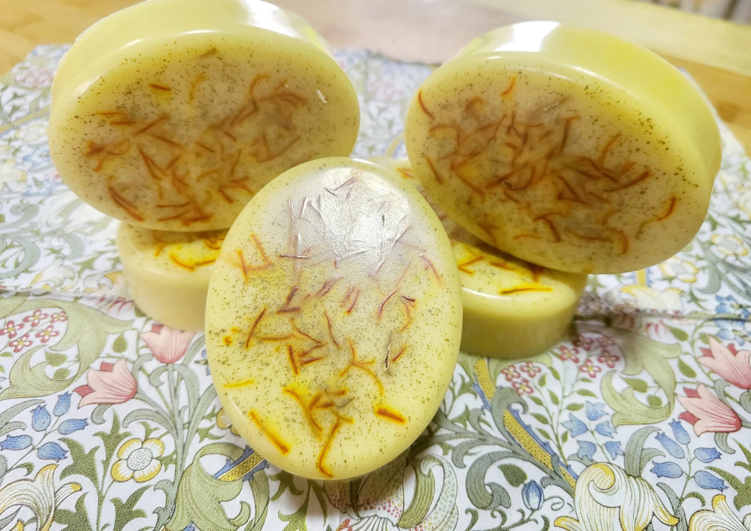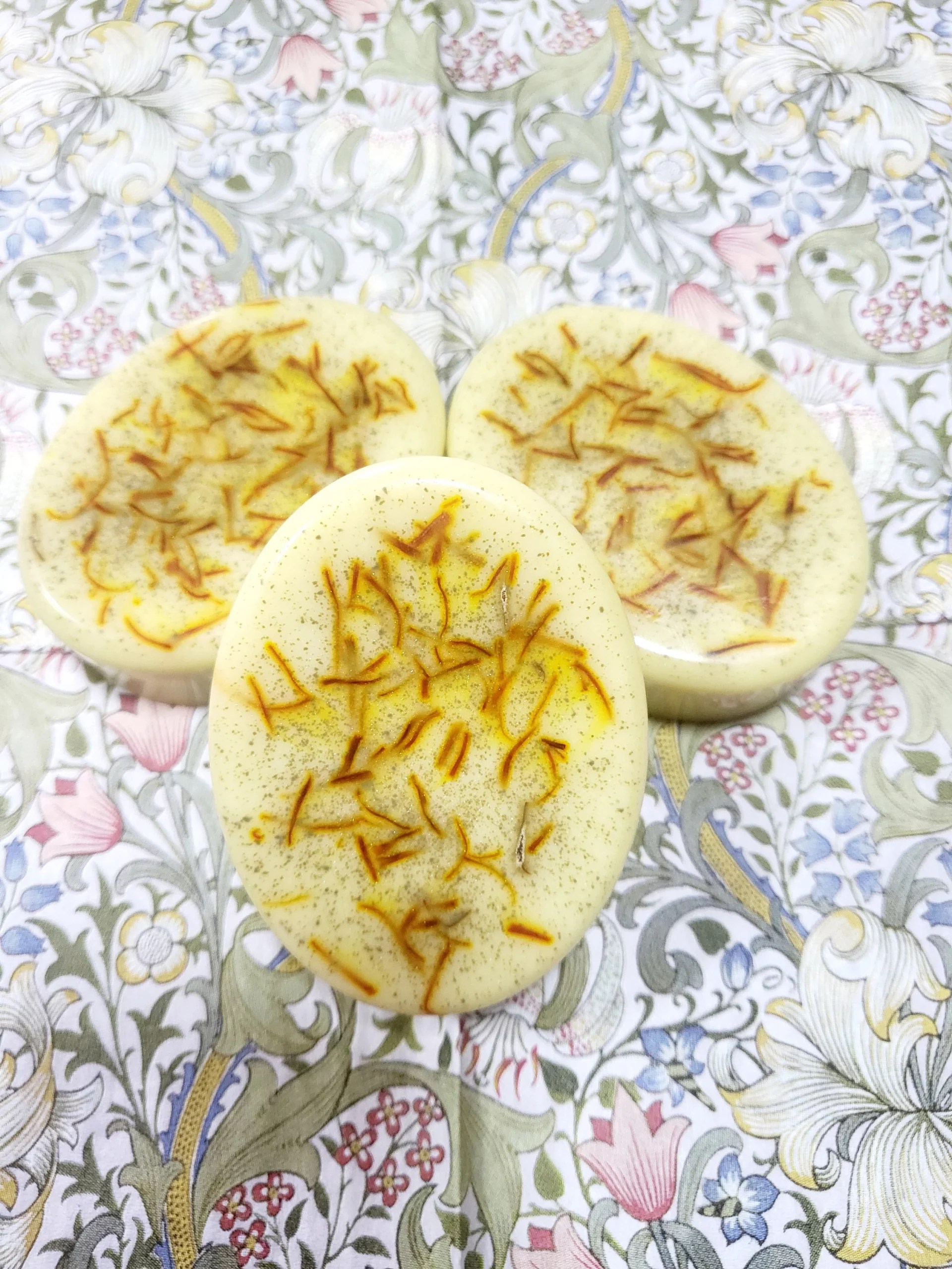 INGREDIENTS: Made with Goats Milk & Vegetable Glycerine, Saffron & Yellow Clay Powder, Patchouli Essential Oil